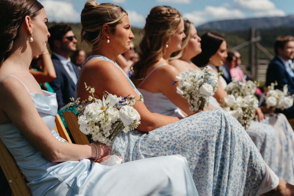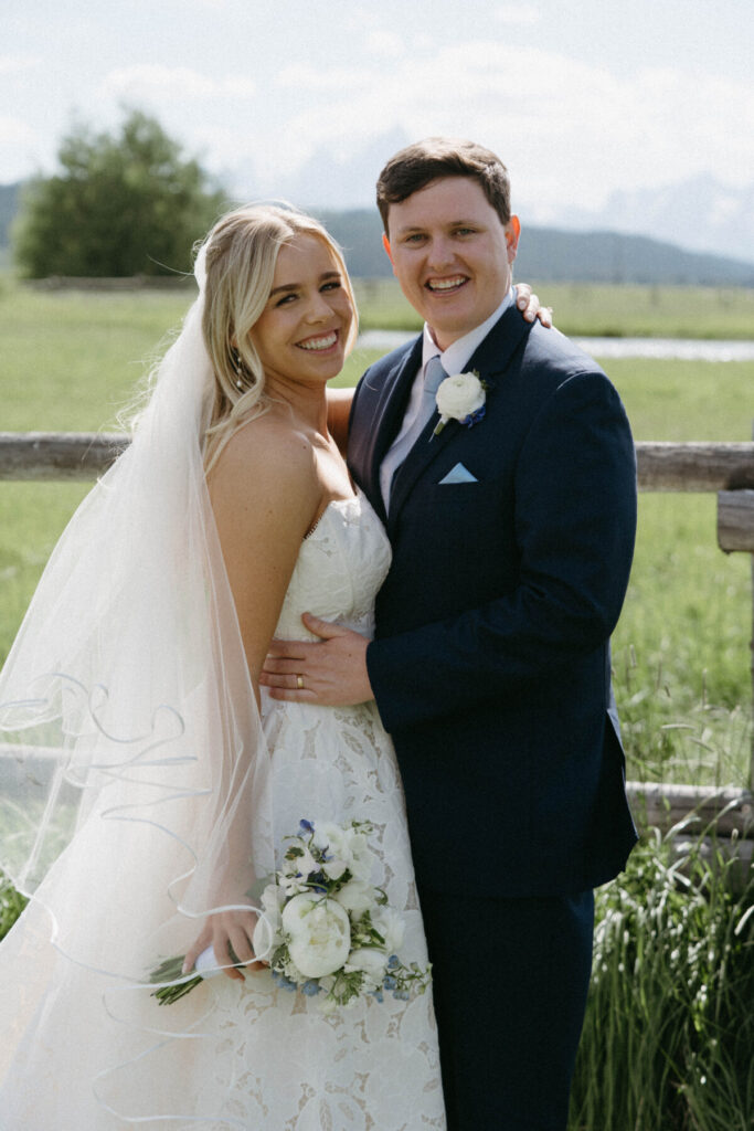 Grace carried a timeless bouquet of white peonies and ranunculus accented with blue delphinium and tweedia. The soft palette reflected the clear Wyoming sky, creating a look that was both airy and classic, effortlessly in harmony with the mountain setting.