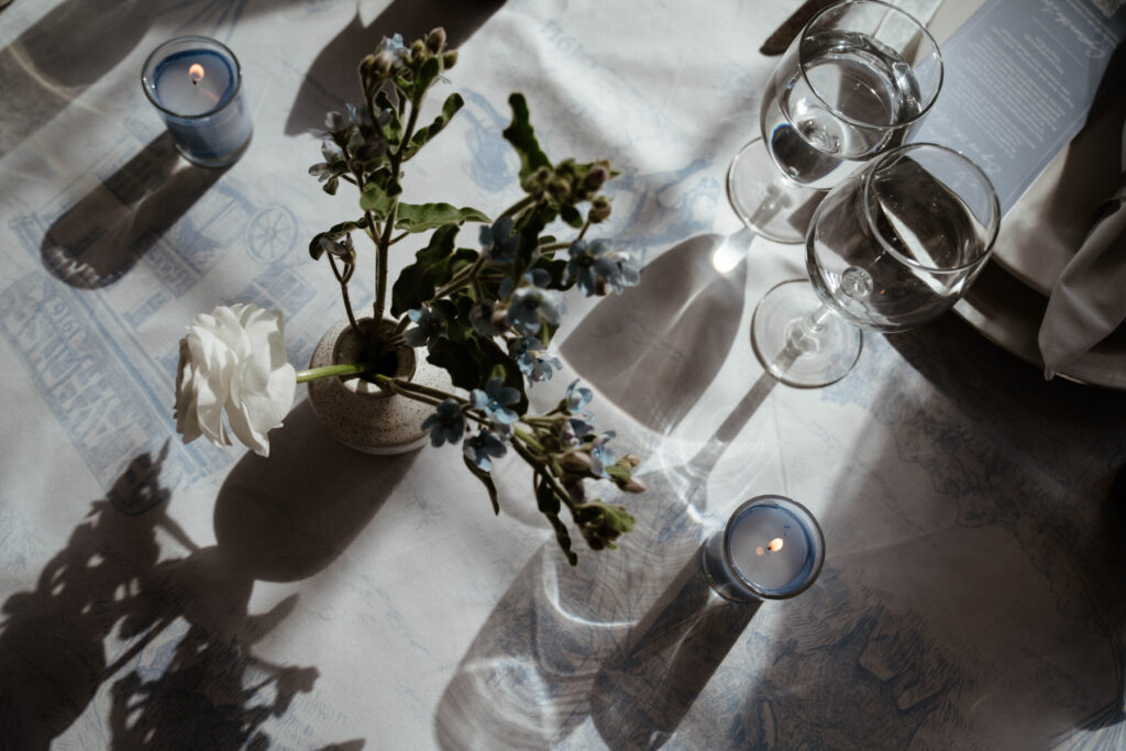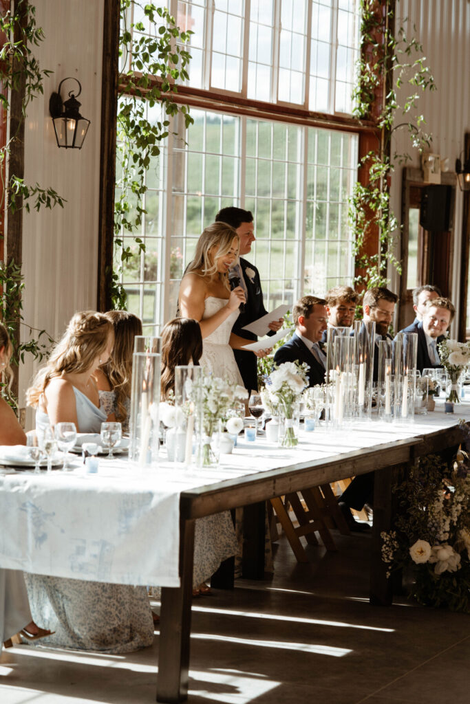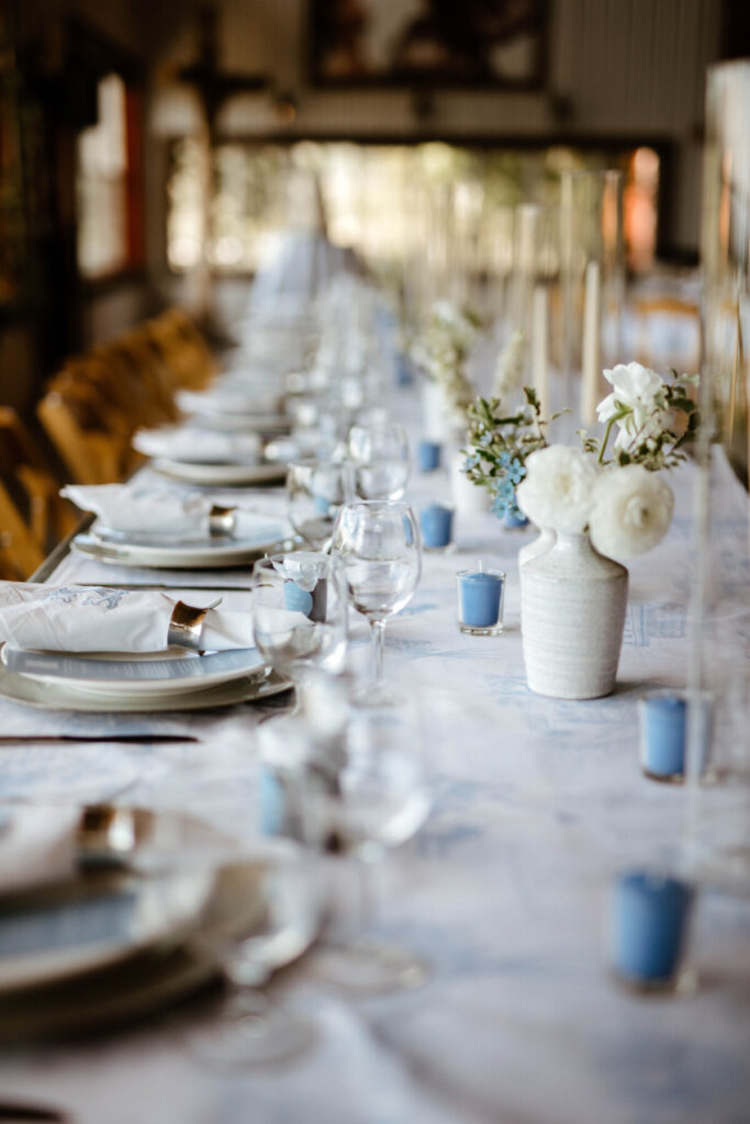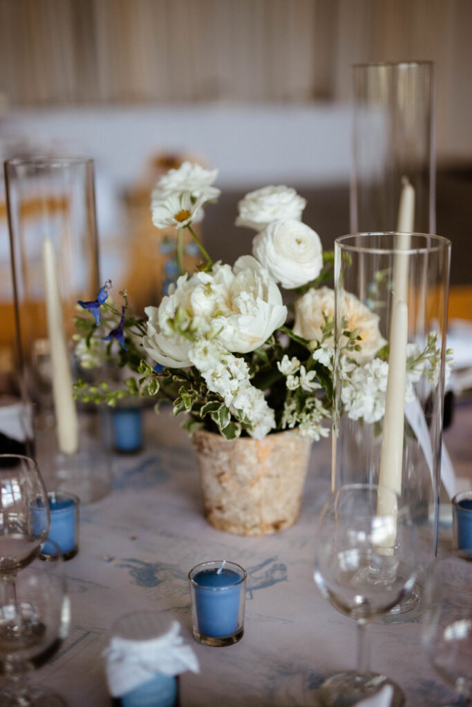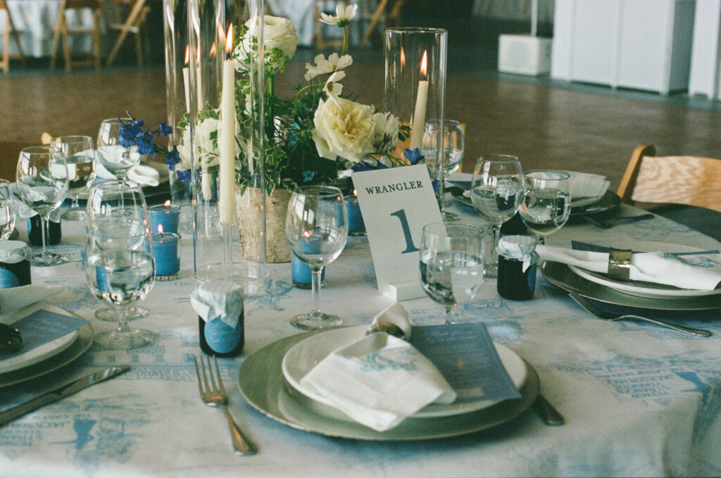 The reception in the barn captured the Western wedding aesthetic perfectly, with natural textures and lively colors that brought warmth and authenticity to the space. Birch wrapped vase arrangements of white and blue flowers adorned each table, bringing color and abundance to the space. The florals and taper candles complemented the custom blue Jackson Hole toile linens by Rendezvous Design, creating an atmosphere that was both welcoming and distinct.