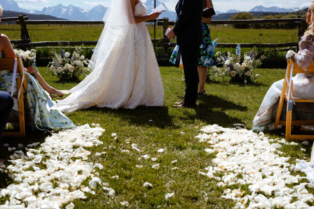 Grace and Kevin’s Jackson Hole wedding ceremony at Diamond Cross Ranch with a white rose petal aisle and mountain backdrop designed by Dandelion Floral.