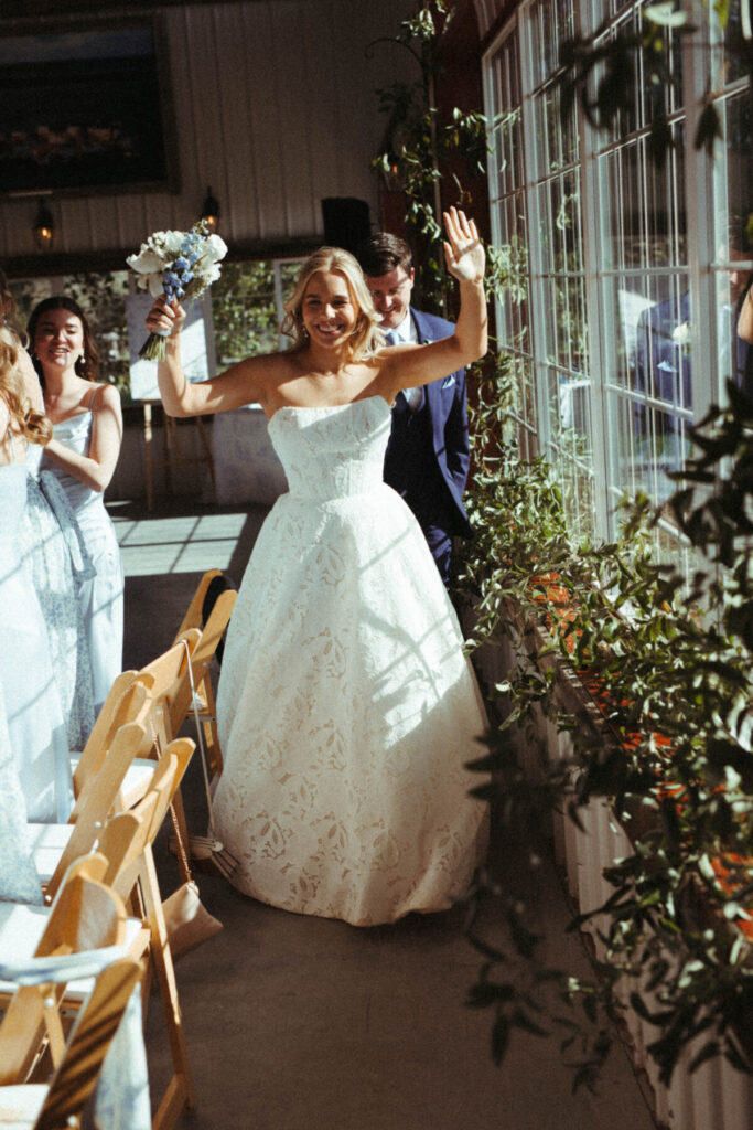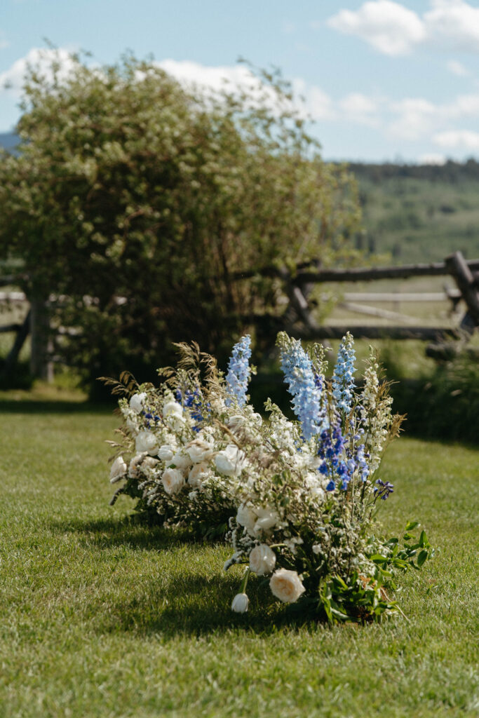 At the ceremony, a white rose petal aisle led guests toward the blue and white meadow ground arrangements and panoramic Teton views, setting a scene that felt grounded in the landscape and softly romantic.