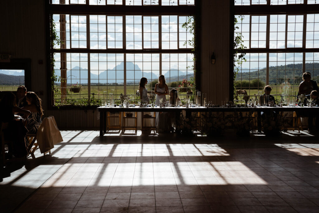 One of the most memorable elements of Grace and Kevin’s Diamond Cross Ranch wedding was the greenery installation framing the venue’s grand windows. The design brought the outdoors in, softening the interior and drawing guests’ eyes toward the Teton Range throughout the evening. It created a sense of continuity between the reception and the mountain views beyond—an intentional reflection of the couple’s connection to place. Ceremony florals were repurposed for reception in front of the head table and the rose petals from the ceremony were put in a basket for guests to toss at the couple’s exit at the end of the night. Every detail, from the bespoke toile linens to the soft glow of candlelight, worked together to create an atmosphere that was both deeply personal and unmistakably Jackson Hole.