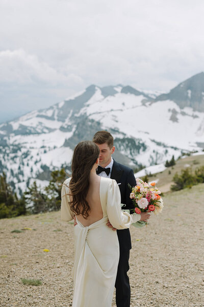 Grace carried a timeless bouquet of white peonies and ranunculus accented with blue delphinium and tweedia. The soft palette reflected the clear Wyoming sky, creating a look that was both airy and classic, effortlessly in harmony with the mountain setting.